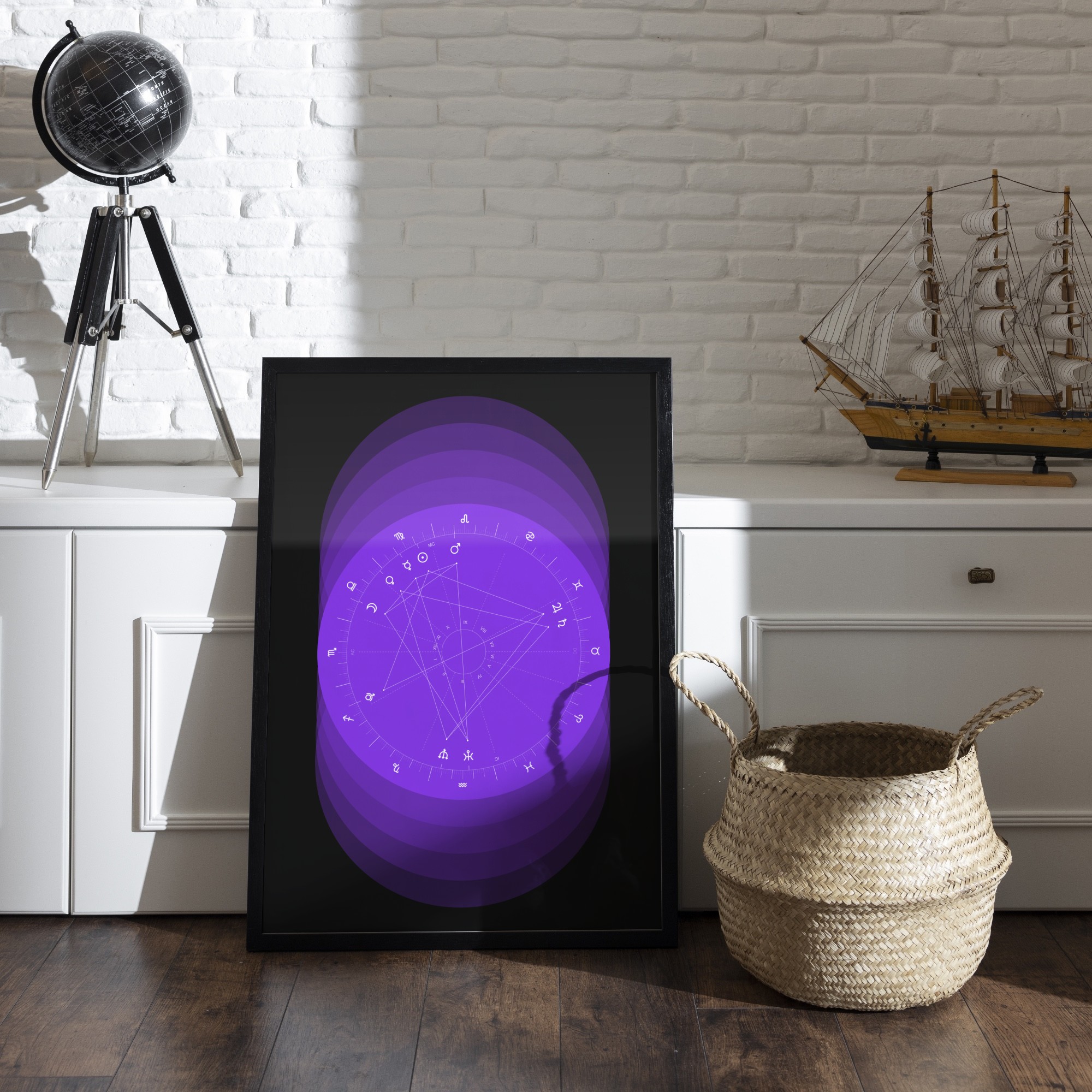 Deze elegante poster toont jouw persoonlijke geboortehoroscoop, gevat in een verfijnd design met gelaagde, overlappende vormen die een diepte-effect creëren. Het gedetailleerde horoscoopwiel presenteert de exacte posities van de planeten en de twaalf sterrenbeelden op het moment van jouw geboorte. Complexe aspectlijnen en de indeling in huizen onthullen de unieke nuances van jouw astrologische blauwdruk. De minimalistische esthetiek en heldere symboliek zorgen voor een tijdloze en luxe uitstraling die in elk interieur past. Jouw poster wordt volledig gepersonaliseerd met jouw exacte geboortegegevens, waardoor elk exemplaar een uniek en diep betekenisvol kunstwerk is. Het is een stijlvolle toevoeging aan jouw interieur en een buitengewoon persoonlijk cadeau-idee.