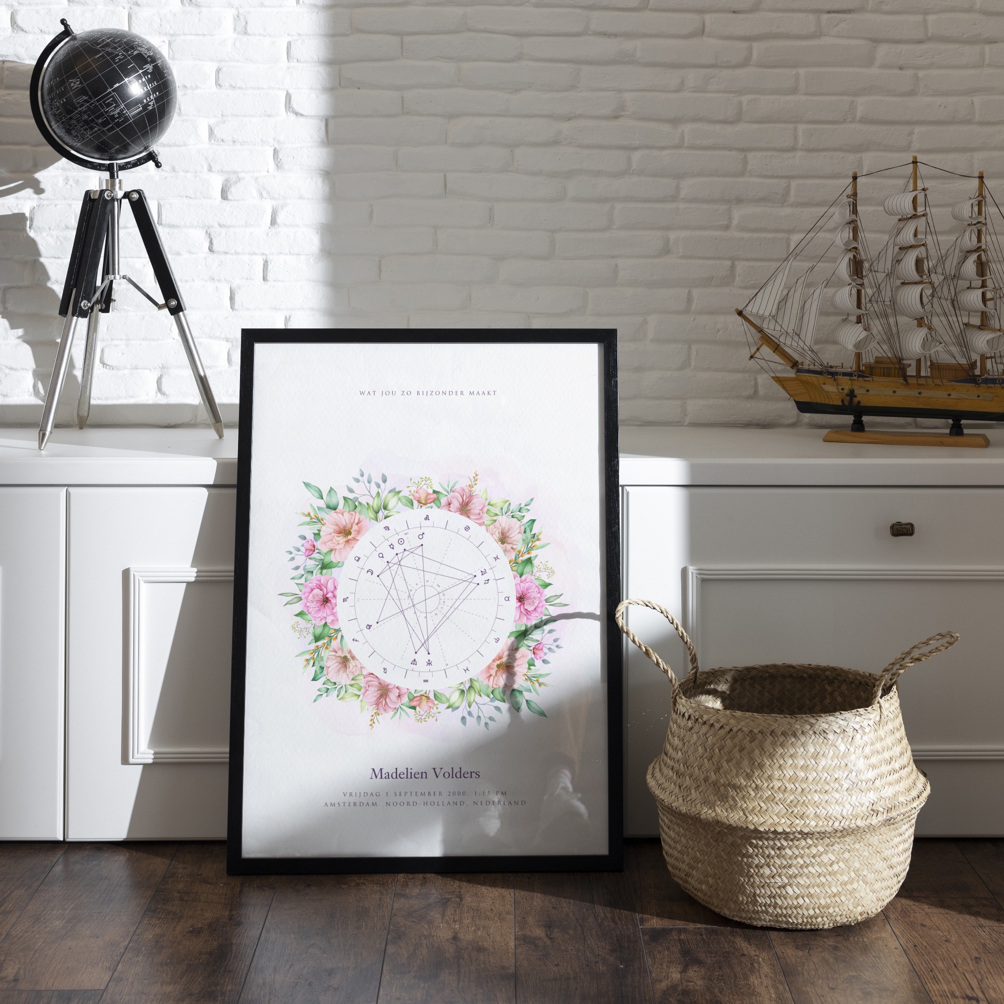 Deze astrologieposter combineert jouw persoonlijke geboortehoroscoop met een elegant bloemenontwerp. In het midden zie je een horoscoopwiel met de standen van de planeten en hun verbindingen, omringd door een sierlijke omlijsting van bloemen die het geheel een verfijnde uitstraling geven. Het ontwerp brengt astrologische symboliek en artistieke schoonheid harmonieus samen. Je kunt de poster volledig personaliseren met jouw eigen gegevens, waardoor hij uniek en betekenisvol wordt. Dit maakt de poster niet alleen een stijlvolle blikvanger voor je interieur, maar ook een bijzonder en persoonlijk cadeau voor iemand die je dierbaar is.