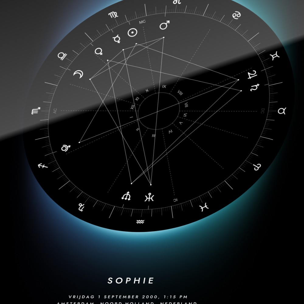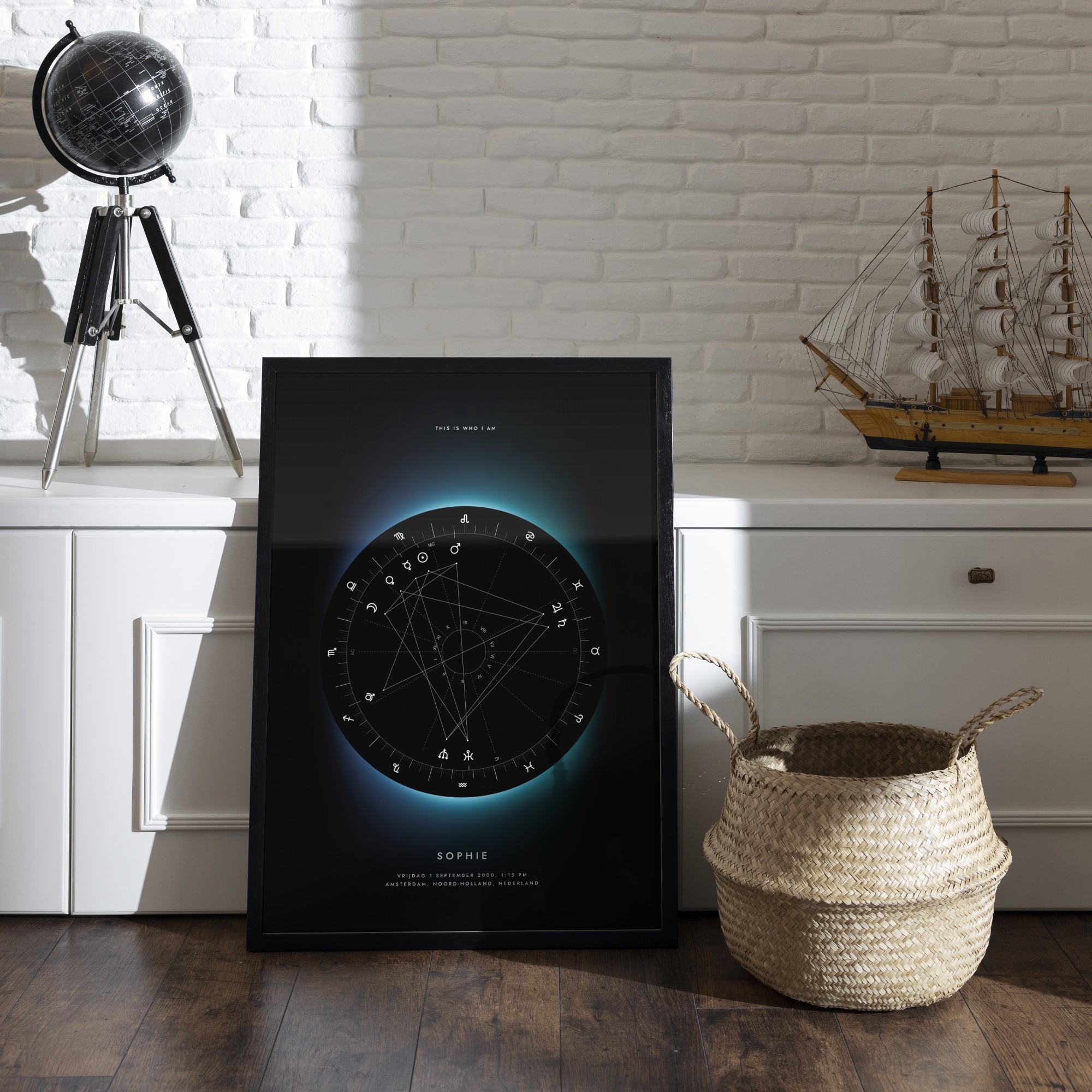 Deze luxe poster toont jouw persoonlijke geboortehoroscoop, omringd door een schitterend spectrum dat doet denken aan een prisma. Het gedetailleerde horoscoopwiel presenteert de exacte posities van de planeten en de twaalf sterrenbeelden op het moment van jouw geboorte. Complexe aspectlijnen en de indeling in huizen onthullen de unieke nuances van jouw astrologische blauwdruk. De stralende gloed en heldere symboliek zorgen voor een tijdloze en luxe uitstraling die in elk interieur past.
