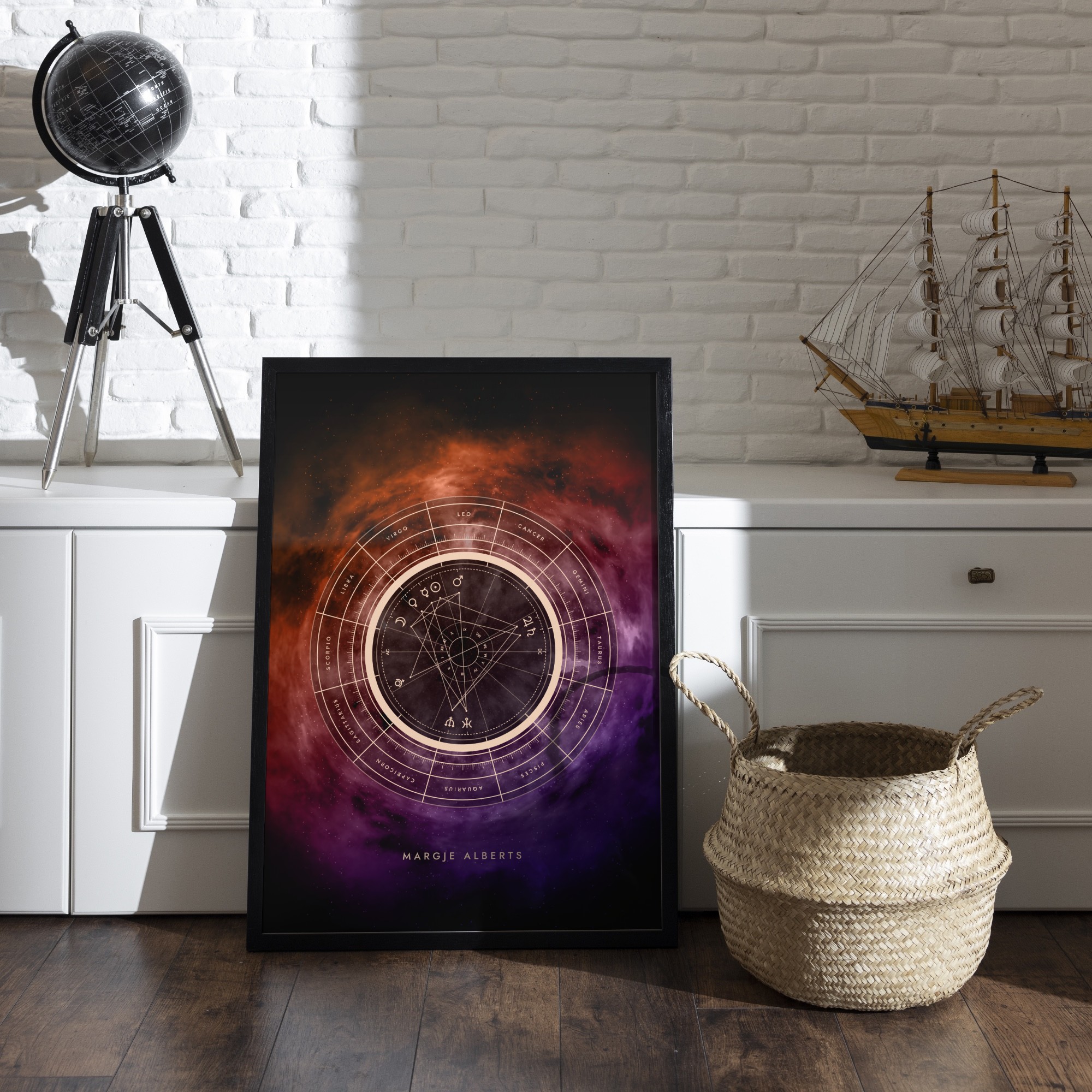Deze spectaculaire geboortehoroscoop zet jouw persoonlijke astrologische kaart tegen een achtergrond van een indrukwekkende sterrenexplosie. Het gedetailleerde horoscoopwiel toont alle planeten, sterrenbeelden, huizen en aspecten zoals zij stonden op het moment van jouw geboorte, terwijl de dramatische explosie van kosmische energie en licht een krachtige omlijsting vormt van jouw unieke astrologische blauwdruk. Deze poster wordt volledig gepersonaliseerd met jouw exacte geboortegegevens. De explosieve energie en kosmische kracht geven dit design een dynamische, bijna mystieke uitstraling. Perfect als statement piece voor jouw interieur of als krachtig persoonlijk cadeau dat de intensiteit van astrologie tot leven brengt.