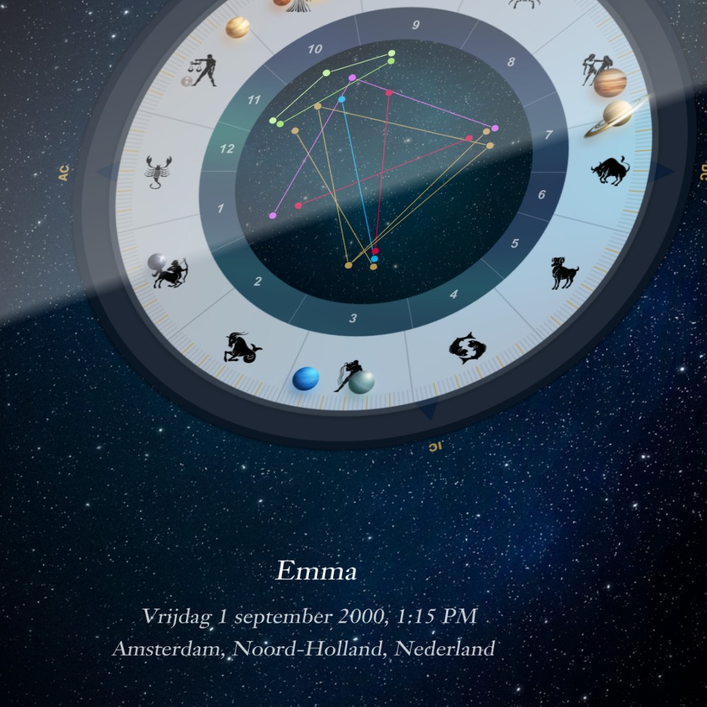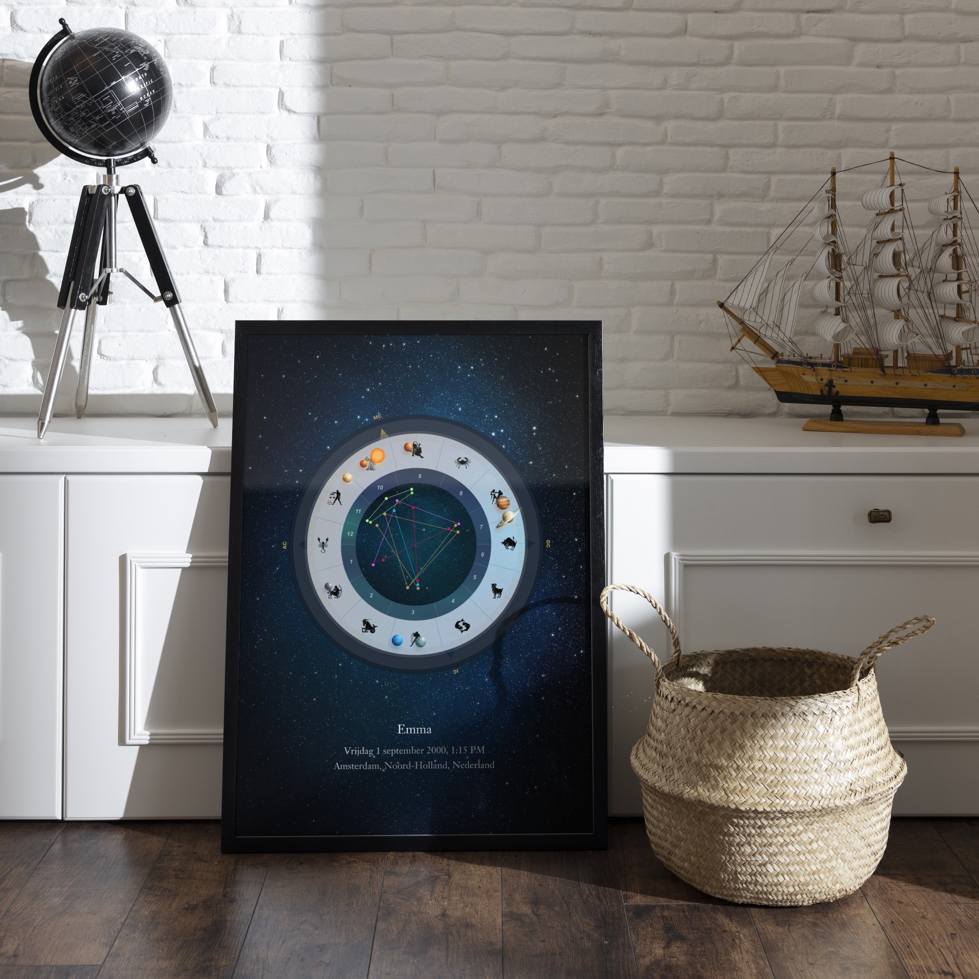 Deze astrologieposter brengt jouw persoonlijke geboortehoroscoop op stijlvolle wijze tot leven. In het ontwerp zie je een horoscoopwiel met de twaalf huizen, de dierenriemtekens en de standen van de planeten, verbonden door hun unieke aspecten. Het resultaat is een gedetailleerde en moderne weergave die zowel astrologische betekenis als visuele schoonheid uitstraalt.