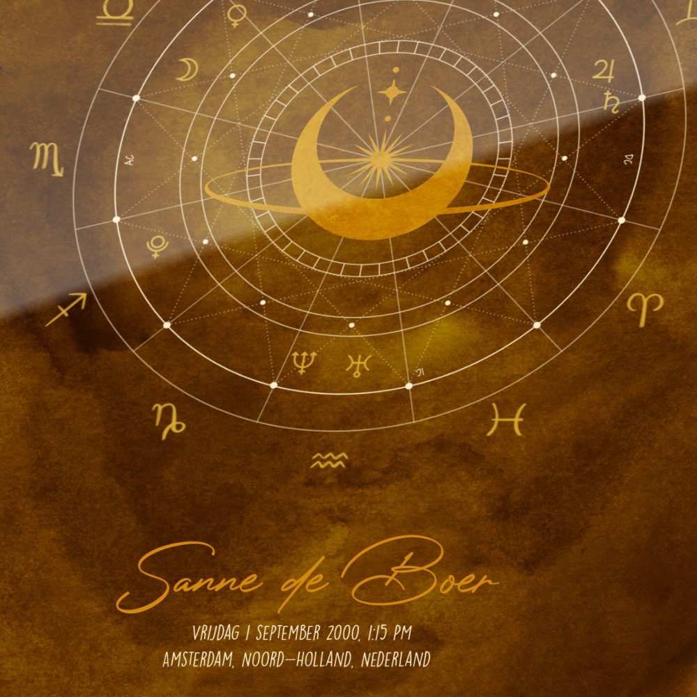 Deze elegante poster toont jouw persoonlijke geboortehoroscoop, prachtig weergegeven op een zachte, waterverf-achtige achtergrond. Het gedetailleerde horoscoopwiel presenteert de exacte posities van de planeten en de twaalf sterrenbeelden op het moment van jouw geboorte. Een centraal hemellichaam met een stralend symbool voegt een mystieke touch toe aan jouw unieke astrologische blauwdruk. De subtiele overgangen en artistieke textuur van de waterverf-achtergrond geven dit design een verfijnde en luxe uitstraling. Jouw poster wordt volledig gepersonaliseerd met jouw exacte geboortegegevens, waardoor elk exemplaar een uniek en diep betekenisvol kunstwerk is. Het is een stijlvolle toevoeging aan jouw interieur en een buitengewoon persoonlijk cadeau-idee.