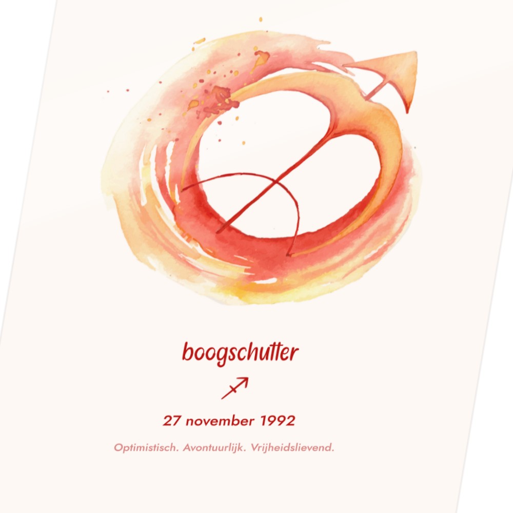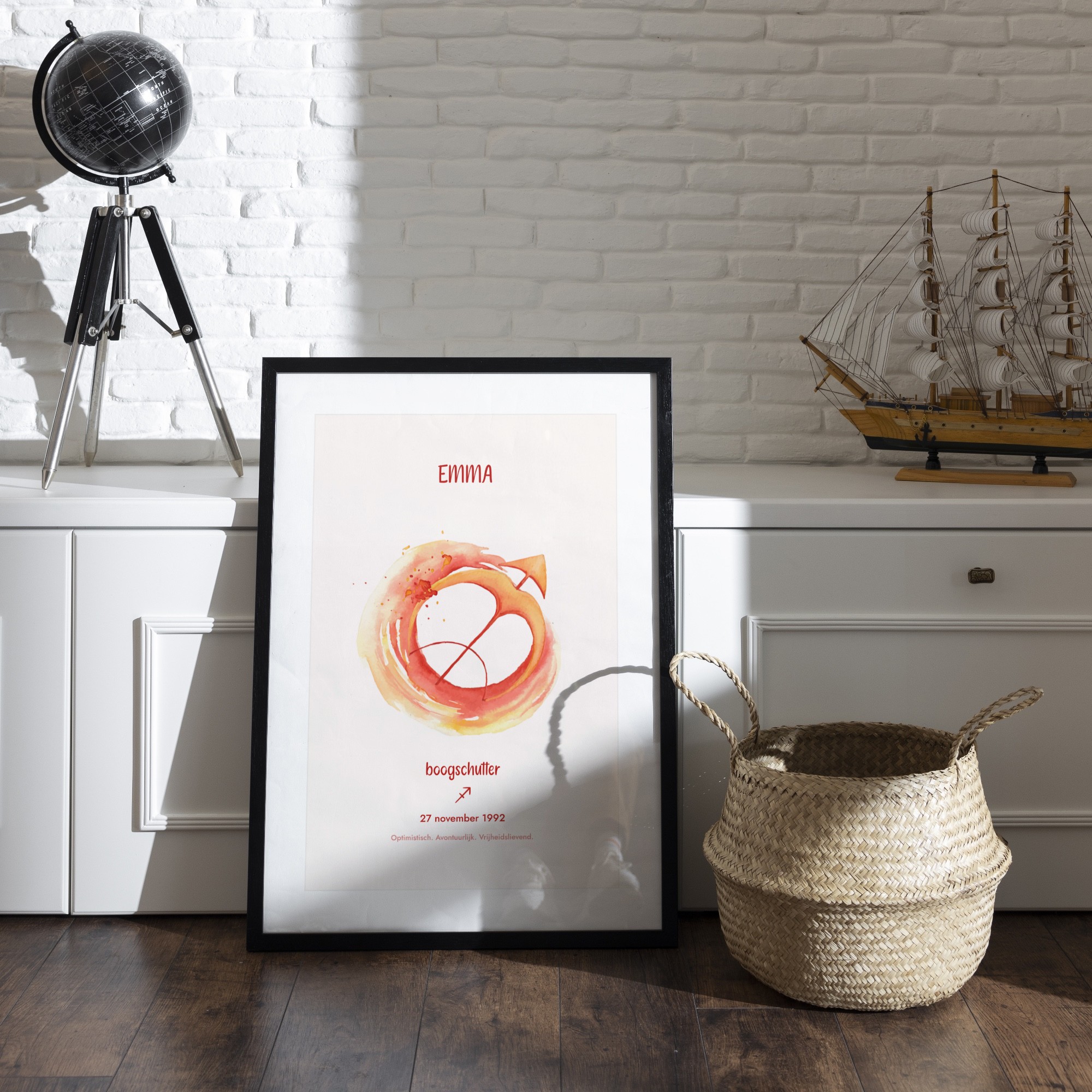 Deze elegante poster viert jouw sterrenbeeld met een artistieke waterverf-interpretatie van het bijbehorende symbool. Het ontwerp toont een prachtig geschilderde weergave van jouw sterrenbeeld, omringd door subtiele sterren en kosmische details. Onderaan vind je jouw sterrenbeeld-symbool en enkele karakteristieke eigenschappen die bij jouw teken horen. De zachte waterverf-texturen creëren een verfijnde, organische uitstraling die perfect past in moderne interieurs. Deze poster wordt volledig gepersonaliseerd voor jouw specifieke sterrenbeeld en geboortegegevens, waardoor elk exemplaar een uniek kunstwerk wordt dat jouw astrologische identiteit weergeeft. Het is een stijlvolle toevoeging aan jouw interieur en een buitengewoon persoonlijk cadeau-idee.