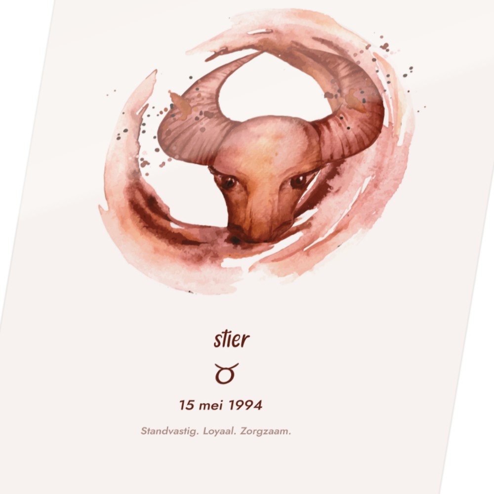 Deze elegante poster viert jouw sterrenbeeld met een artistieke waterverf-interpretatie van het bijbehorende symbool. Het ontwerp toont een prachtig geschilderde weergave van jouw sterrenbeeld, omringd door subtiele sterren en kosmische details. Onderaan vind je jouw sterrenbeeld-symbool en enkele karakteristieke eigenschappen die bij jouw teken horen. De zachte waterverf-texturen creëren een verfijnde, organische uitstraling die perfect past in moderne interieurs. Deze poster wordt volledig gepersonaliseerd voor jouw specifieke sterrenbeeld en geboortegegevens, waardoor elk exemplaar een uniek kunstwerk wordt dat jouw astrologische identiteit weergeeft. Het is een stijlvolle toevoeging aan jouw interieur en een buitengewoon persoonlijk cadeau-idee.