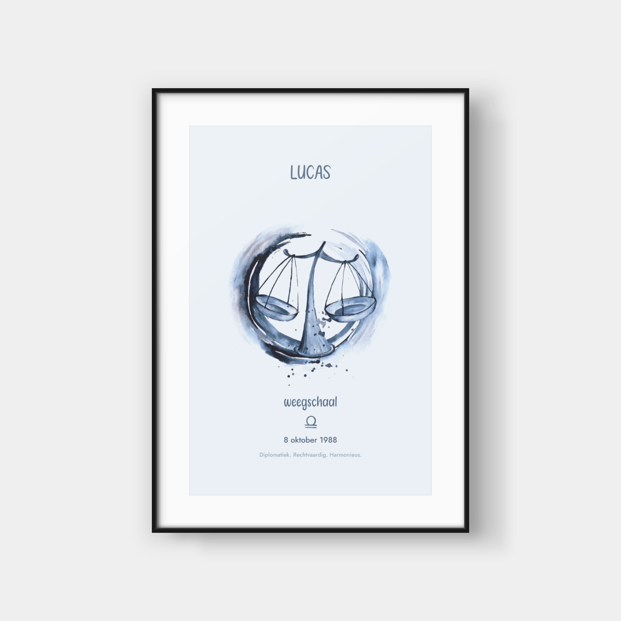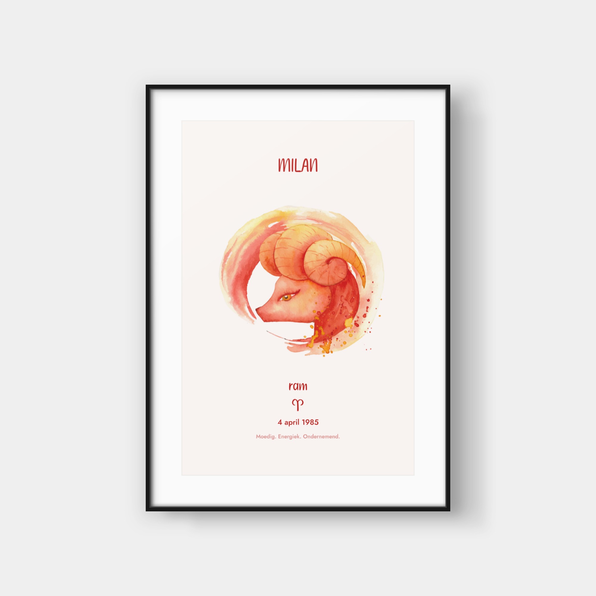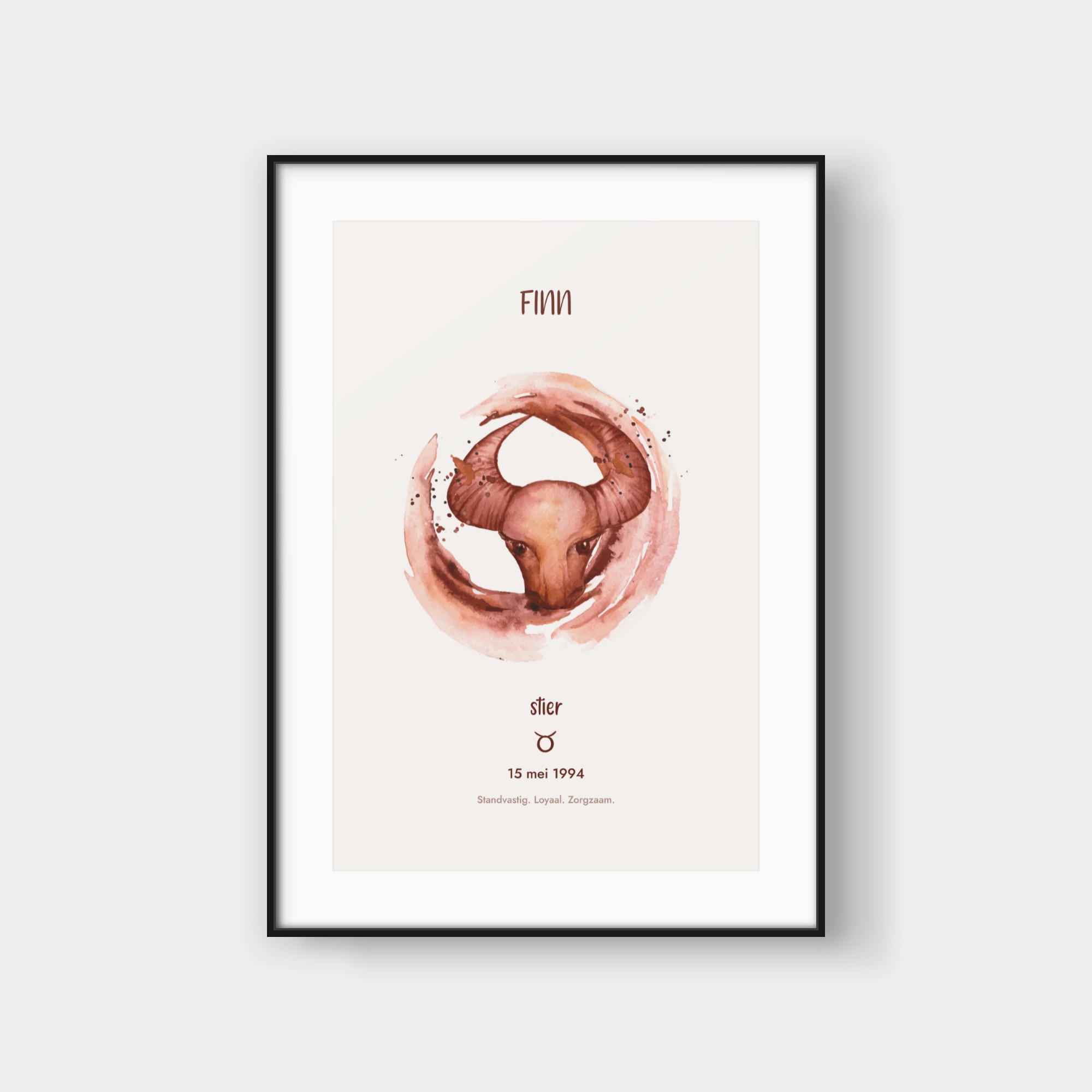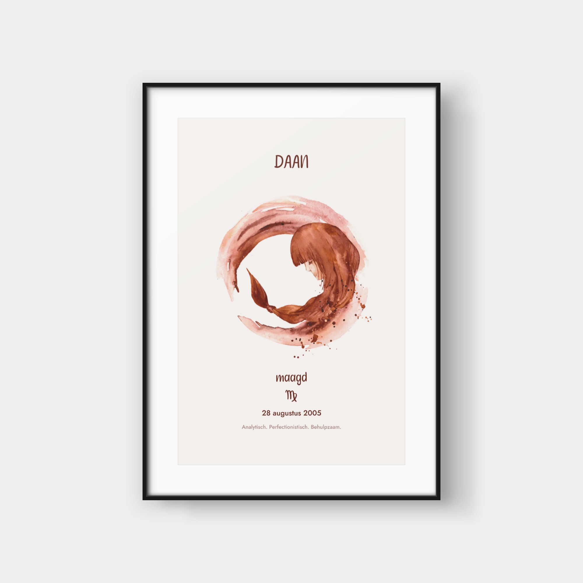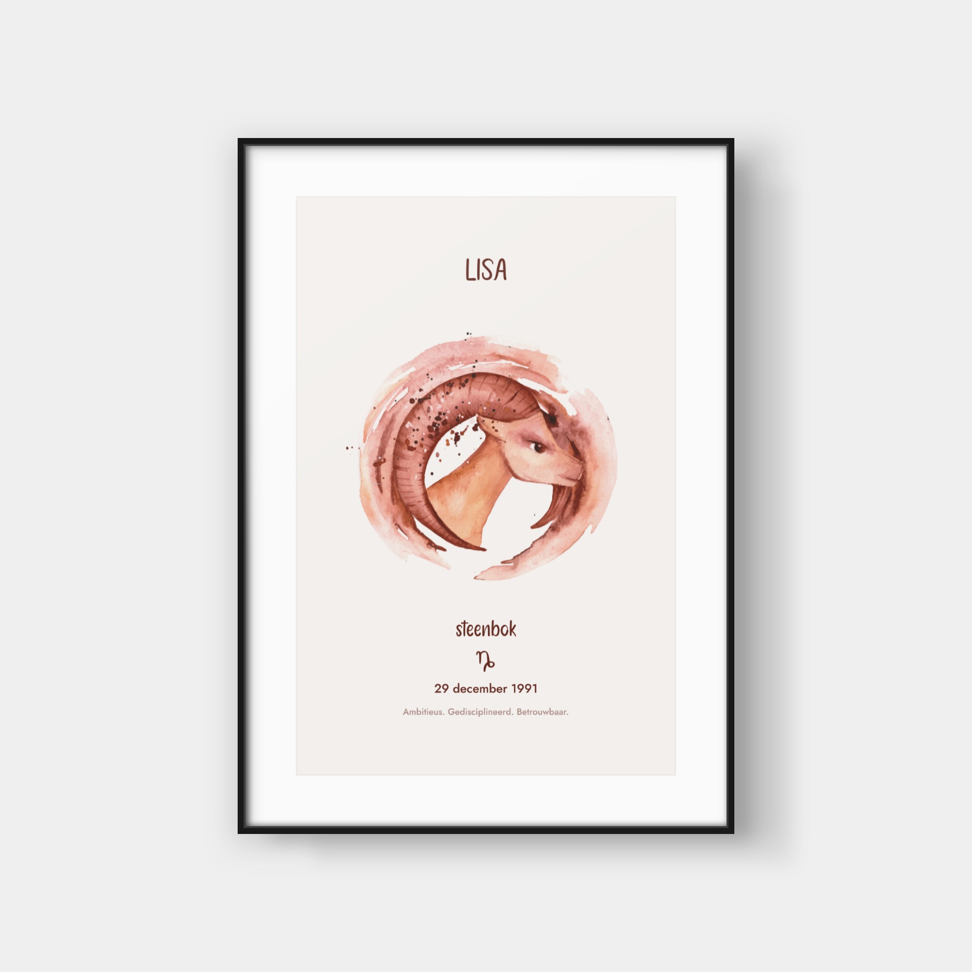 Deze elegante poster viert jouw sterrenbeeld met een artistieke waterverf-interpretatie van het bijbehorende symbool. Het ontwerp toont een prachtig geschilderde weergave van jouw sterrenbeeld, omringd door subtiele sterren en kosmische details. Onderaan vind je jouw sterrenbeeld-symbool en enkele karakteristieke eigenschappen die bij jouw teken horen. De zachte waterverf-texturen creëren een verfijnde, organische uitstraling die perfect past in moderne interieurs. Deze poster wordt volledig gepersonaliseerd voor jouw specifieke sterrenbeeld en geboortegegevens, waardoor elk exemplaar een uniek kunstwerk wordt dat jouw astrologische identiteit weergeeft. Het is een stijlvolle toevoeging aan jouw interieur en een buitengewoon persoonlijk cadeau-idee.