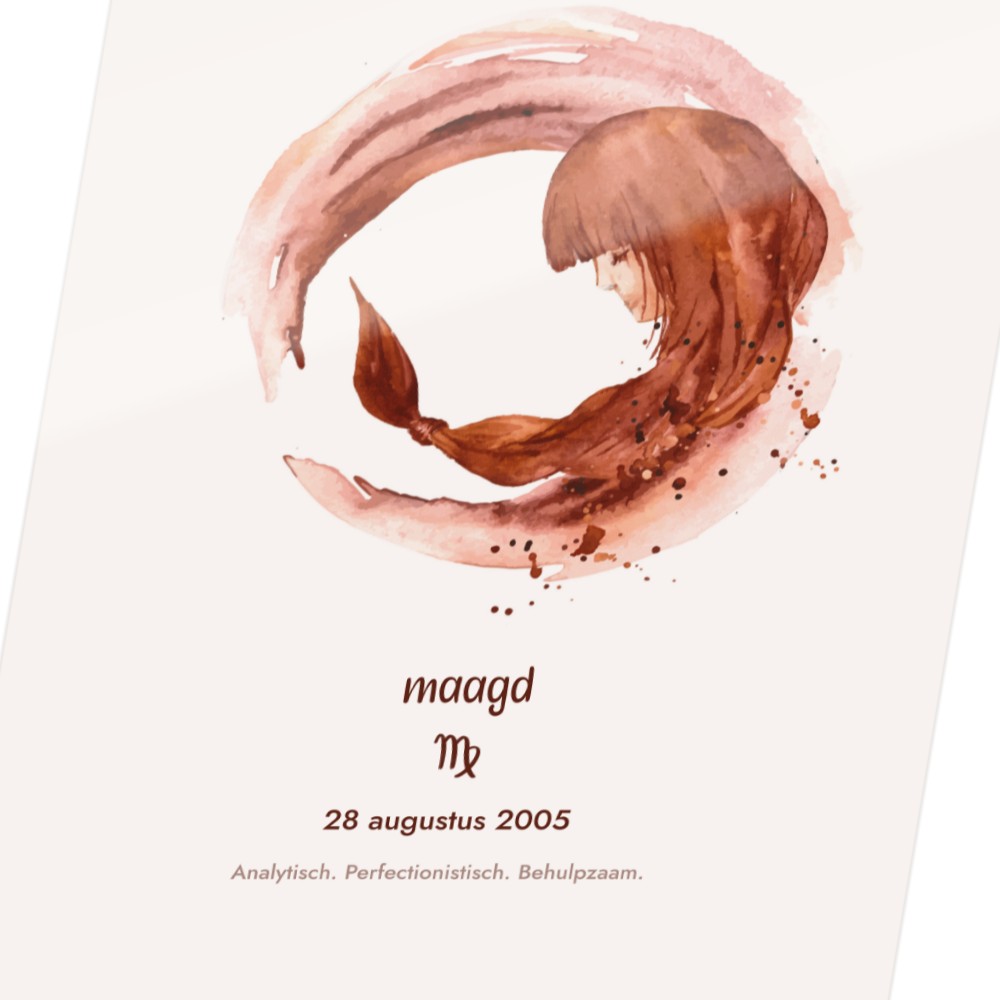 Deze elegante poster viert jouw sterrenbeeld met een artistieke waterverf-interpretatie van het bijbehorende symbool. Het ontwerp toont een prachtig geschilderde weergave van jouw sterrenbeeld, omringd door subtiele sterren en kosmische details. Onderaan vind je jouw sterrenbeeld-symbool en enkele karakteristieke eigenschappen die bij jouw teken horen. De zachte waterverf-texturen creëren een verfijnde, organische uitstraling die perfect past in moderne interieurs. Deze poster wordt volledig gepersonaliseerd voor jouw specifieke sterrenbeeld en geboortegegevens, waardoor elk exemplaar een uniek kunstwerk wordt dat jouw astrologische identiteit weergeeft. Het is een stijlvolle toevoeging aan jouw interieur en een buitengewoon persoonlijk cadeau-idee.
