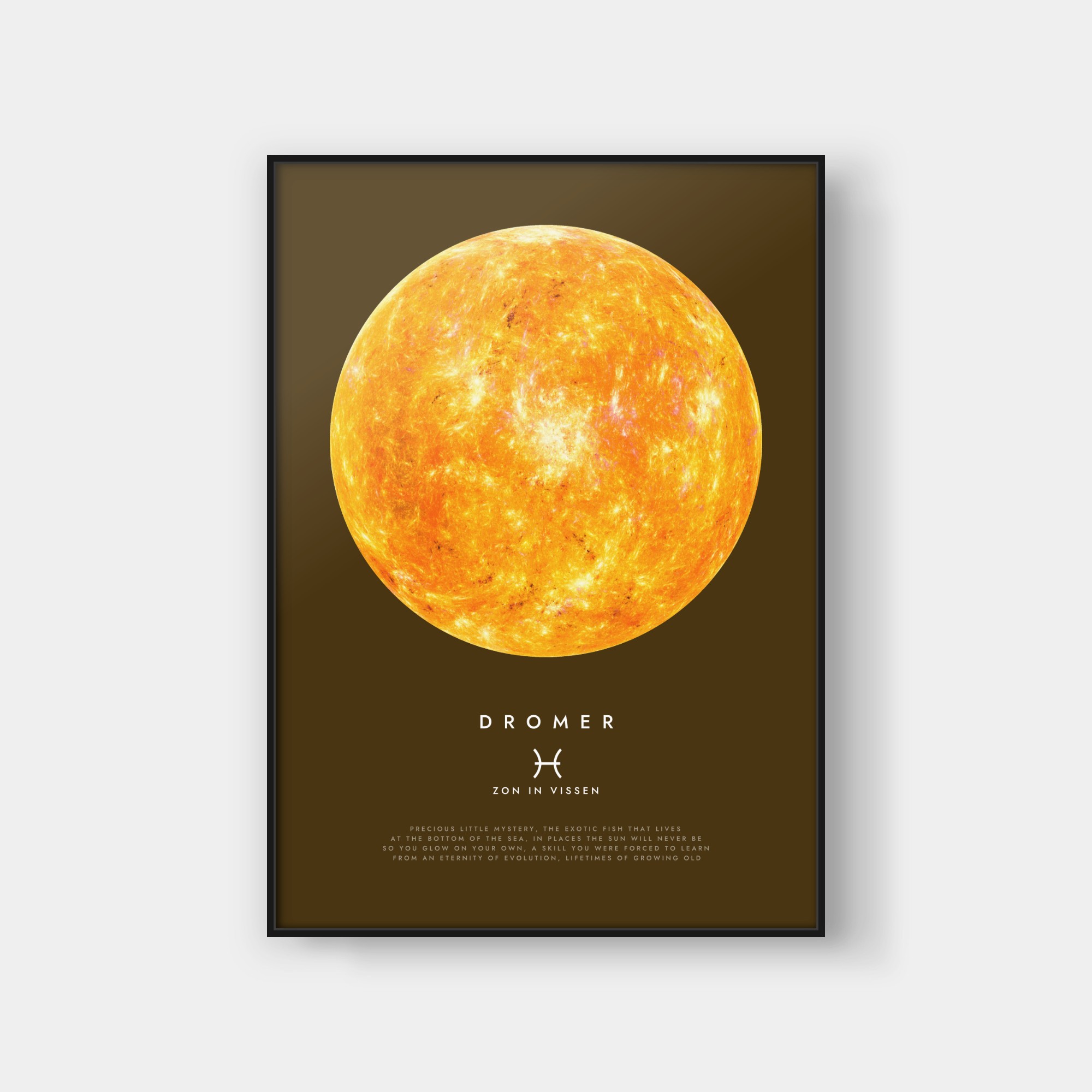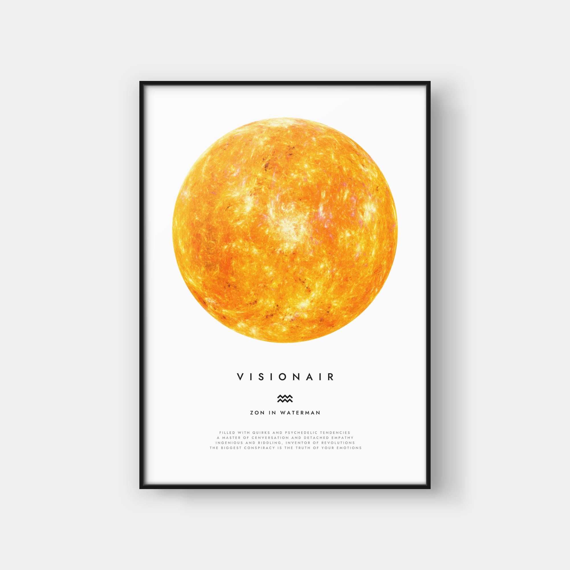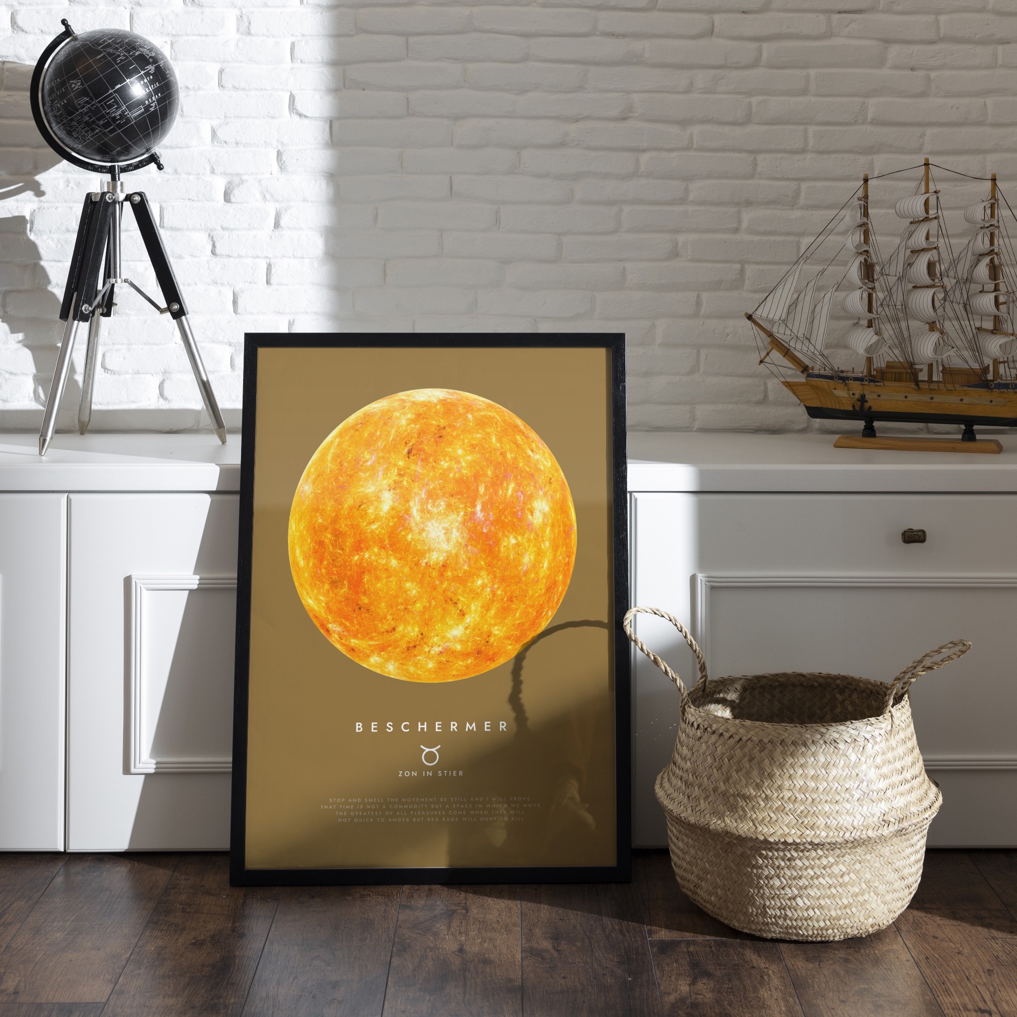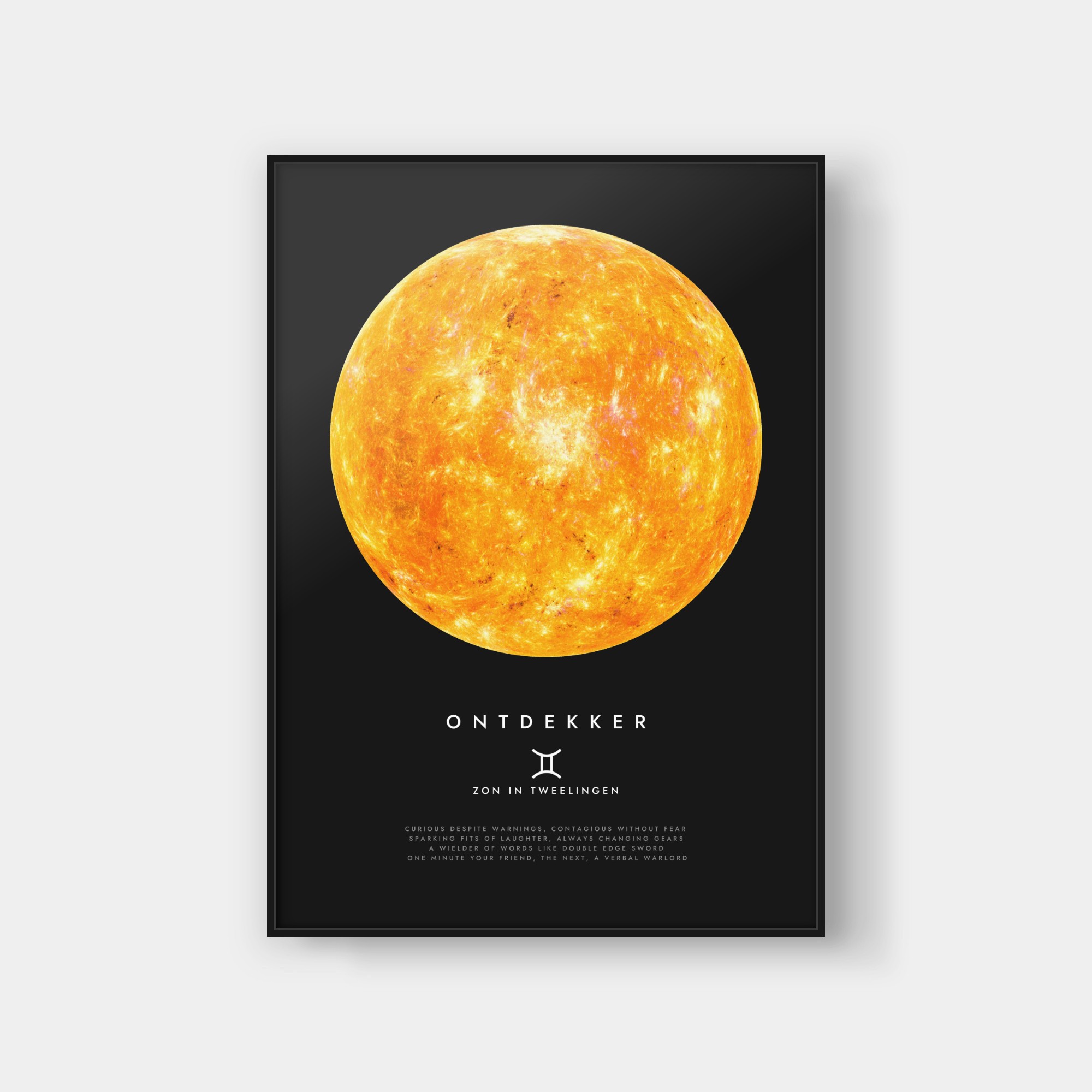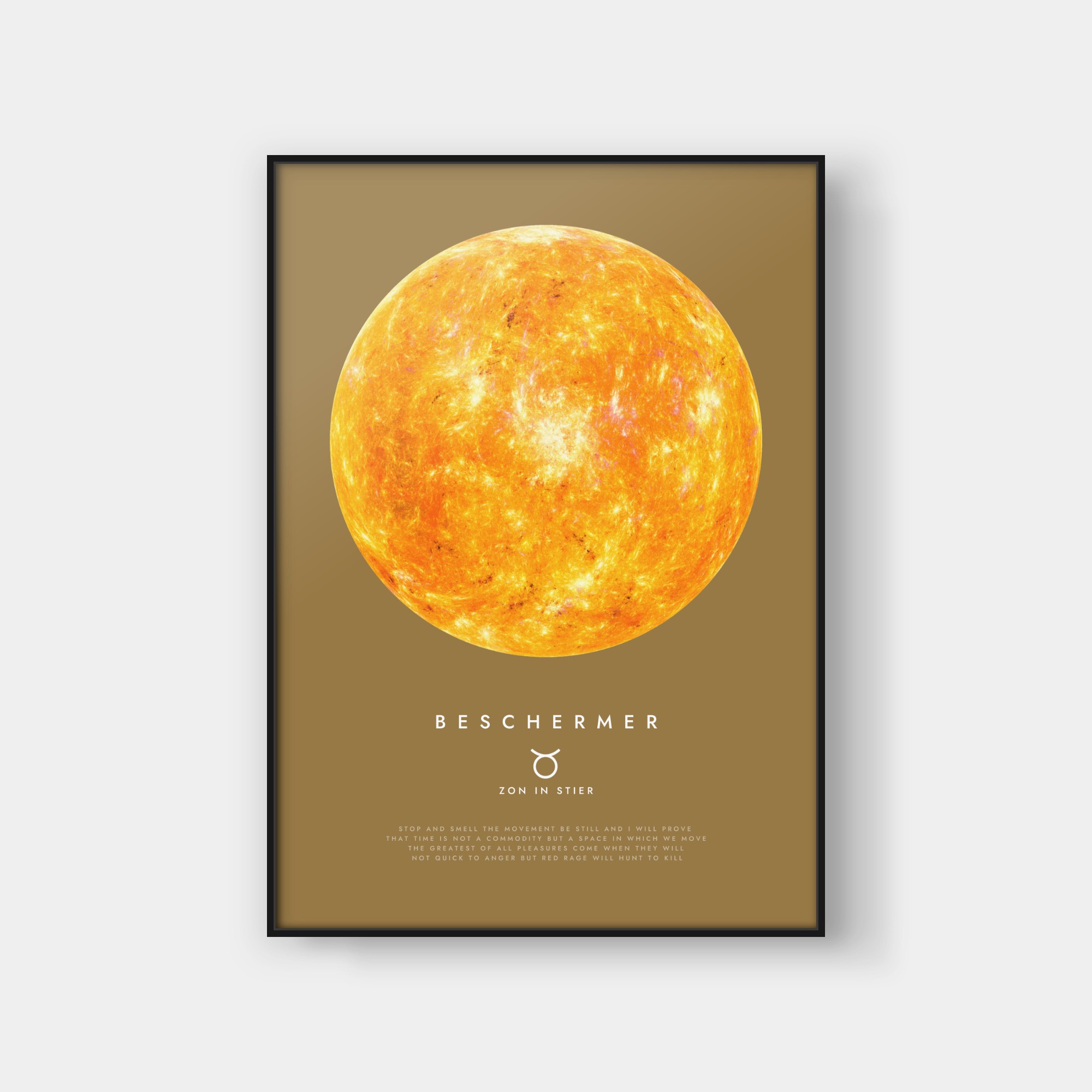 Deze astrologieposter toont de zon als stralend middelpunt, met jouw sterrenbeeld subtiel verwerkt in het ontwerp. De combinatie van een krachtige, gedetailleerde zon en een minimalistische opmaak geeft de poster een moderne en elegante uitstraling. Door de persoonlijke toevoeging van jouw sterrenbeeld en bijpassende eigenschappen wordt dit kunstwerk uniek en betekenisvol.